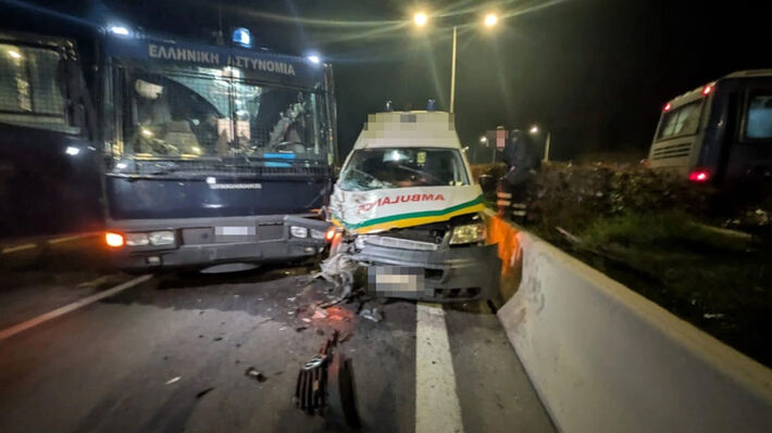 Ασθενοφόρο «καρφώθηκε» σε κλούβα των ΜΑΤ που είχε κλείσει την Εθνική Οδό (!) στον Πλατύκαμπο