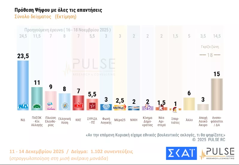 Η δημοσκοπική πτώση της ΝΔ φάνηκε και στην έρευνα της Pulse. Συγκεκριμένα καταγράφηκε πτώση μίας μονάδας σε σχέση με την μέτρηση Νοεμβρίου (23,5%). Ακολουθεί το ΠΑΣΟΚ με 11%, ενώ ανοδικά είναι τα ποσοστά της Πλεύσης Ελευθερίας (από 7% σε 9%). Η Ελληνική Λύση συγκεντρώνει 8% στην πρόθεση ψήφου, το ΚΚΕ 7%, ο ΣΥΡΙΖΑ 5,5%, η Φωνή Λογικής 3%.