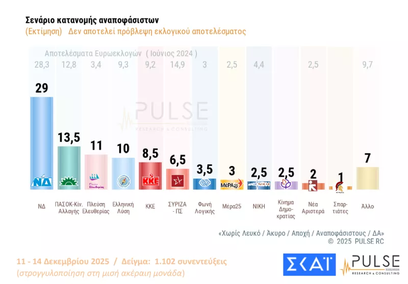 Στο σενάριο κατανομής αναποφάσιστων, η ΝΔ συγκεντρώνει 29%, το ΠΑΣΟΚ 13,5%, η Πλεύση Ελευθερίας 11%, η Ελληνική Λύση 10%, το ΚΚΕ 8,5%, ο ΣΥΡΙΖΑ 6,5%, η Φωνή Λογικής 3,5% και το ΜέΡΑ25 3%.