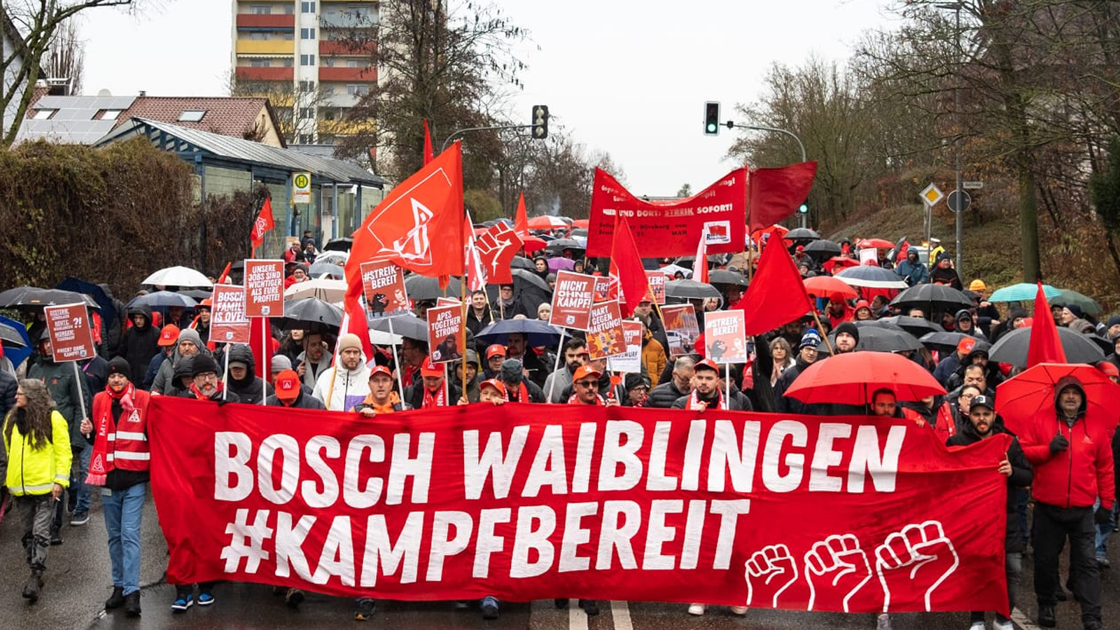 Δυναμική και μαζική διαδήλωση ενάντια στο κλείσιμο του εργοστασίου της Bosch στην πόλη του Waiblingen πραγματοποιήθηκε σήμερα στη Γερμανία.Στην κινητοποίηση έδωσαν το «παρών» τόσο οι εργαζόμενοι του εργοστασίου, όσο και εργαζόμενοι από άλλα εργοστάσια της Bosch αλλά και άλλους κλάδους εκφράζοντας έμπρακτα την αλληλεγγύη τους και τονίζοντας ότι «ο αγώνας είναι κοινός».Οι διαδηλωτές ξεκαθάρισαν πως δεν πρόκειται να αποδεχτούν αυτή την απόφαση και όπως έγραφε και το πανό τους είναι «έτοιμοι για μάχη».Σύμφωνα με τις ανακοινώσεις, το εργοστάσιο θα κλείσει το 2028 αφήνοντας μετέωρους 560 εργαζόμενους.Στης Γερμανία συνεχίζεται το κλείσιμο εργοστασίων σε κλάδους της μεταποιητικής βιομηχανίας, με κατάργηση χιλιάδων θέσεων εργασίας, ως αποτέλεσμα του παγκόσμιου καπιταλιστικού ανταγωνισμού, με τα γερμανικά μονοπώλια να προσπαθούν να ενισχύσουν την ανταγωνιστικότητά τους και την κερδοφορία τους τσακίζοντας έτσι εργασιακά δικαιώματα, αναπροσαρμόζοντας γραμμές παραγωγής στο πλαίσιο της στροφής στην πολεμική οικονομία. Πριν 2 μήνες η «Bosch» είχε ανακοινώσει την περικοπή 13.000 θέσεων εργασίας, ενώ ήδη η θυγατρική της, η «BSH Hausgerate» ανακοίνωσε την κατάργηση 1.400 θέσεων εργασίας καθώς κλείνει δύο εργοστάσια, σε Βάδη – Βυρτεμβέργη και Βρανδεμβούργο, λόγω της κάμψης στην αγορά οικιακών συσκευών.