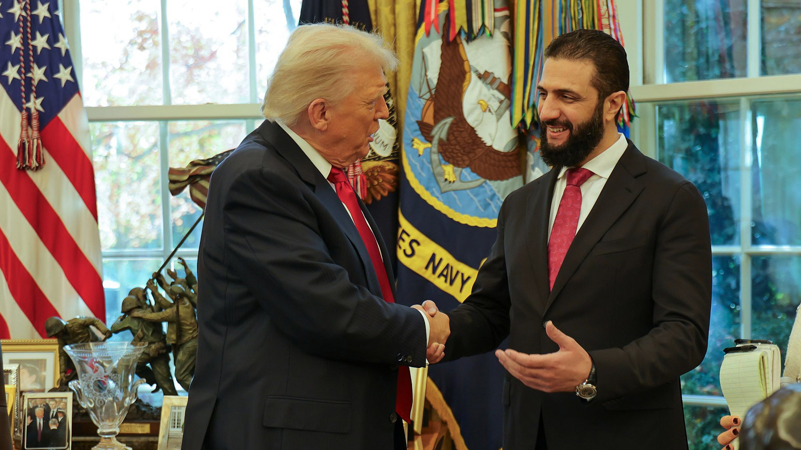Τον τζιχαντιστή «μεταβατικό πρόεδρο» της Συρίας, Άχμεντ Αλ Σαράα (Τζολάνι ως πολέμαρχος) υποδέχτηκε χθες ο πρόεδρος των ΗΠΑ Ντόναλντ Τραμπ, επιδιώκοντας περαιτέρω συνεργασία με στόχο την προώθηση ευρύτερων αμερικανικών γεωπολιτικών συμφερόντων στη Μέση Ανατολή.Ο Τραμπ χαιρετήθηκε στην κεντρική είσοδο του Λευκού Οίκου με τον υποτιθέμενο πρώην εχθρό του και έκαναν κοινές δηλώσεις σε δημοσιογράφους. Ως αποτέλεσμα της συνάντησης, το υπουργείο Οικονομικών ανακοίνωσε ότι αίρει τις κυρώσεις του σκληρού «νόμου Καίσαρα», που προκαλούσε οικονομική ασφυξία στη Συρία επί προεδρίας Μπασάρ Άσαντ, διατηρώντας για 180 μέρες κάποιες διατάξεις που αφορούν τις συναλλαγές της συριακής κυβέρνησης με Ρωσία και Ιράν.Πριν τη συνάντηση Τραμπ – Σαράα στον Λευκό Οίκο, ο Τομ Μπάρακ, πρέσβης των ΗΠΑ στην Τουρκία και ειδικός απεσταλμένος τους στη Συρία, δήλωσε πως ο τζιχαντιστής «πρόεδρος» θα μπορούσε να υπογράψει μια συμφωνία «προσχώρησης» στην υπό αμερικανική ηγεσία «συμμαχία κατά του “Ισλαμικού Κράτους”».Σύμφωνα δε με δηλώσεις Σύρου αξιωματούχου στο Γαλλικό Πρακτορείο, κατά την επίσκεψη Σαράα στις ΗΠΑ -που ξεκίνησε το Σάββατο- θα μπορούσε να υπογραφεί και συμφωνία για τη δημιουργία αμερικανικής στρατιωτικής βάσης κοντά στη Δαμασκό, τάχα για «συντονισμό» της «ανθρωπιστικής βοήθειας» και της «παρατήρησης εξελίξεων μεταξύ Συρίας και Ισραήλ», ενώ δεν αποκλείεται η αναζήτηση χρηματοδότησης της ανοικοδόμησης της Συρίας (ύψους εκατοντάδων δισ. δολαρίων) από αμερικανικά μονοπώλια. Στα πλάνα συνεργασίας Ουάσιγκτον – Δαμασκού εντάσσεται και το παζάρι σε σχέση με την πιθανή επίτευξη συμφώνου μη επίθεσης μεταξύ Συρίας – Ισραήλ, ώστε να εξομαλυνθεί η κατάσταση στα σύνορα των δύο χωρών (στο φόντο της κατάκτησης σημαντικών συριακών εδαφών από το Ισραήλ).Την Παρασκευή, ένα 24ωρο πριν την άφιξη του τζιχαντιστή «προέδρου» στην Ουάσιγκτον για την πρώτη επίσημη επίσκεψη Σύρου ηγέτη στις ΗΠΑ από το 1946, το Στέιτ Ντιπάρμεντ ήρε το όνομα του Σαράα από τη μαύρη λίστα των κυρώσεων, συνεκτιμώντας την προθυμία του να «συνεργαστεί» στον εντοπισμό Αμερικανών αγνοούμενων στη Συρία και στην «εξάλειψη» οποιωνδήποτε στοιχείων χημικών όπλων.Πριν την έναρξη της επίσημης επίσκεψης του Σαράα στην Ουάσιγκτον έγιναν συναντήσεις με Αμερικανούς στρατιωτικούς αξιωματούχους …και ένας αγώνας μπάσκετ με τον διοικητή της Κεντρικής Διοίκησης του αμερικανικού στρατού (CENTCOM) Μπραντ Κούπερ και τον επικεφαλής του «συνασπισμού των ΗΠΑ κατά του “Ισλαμικού Κράτους”», Κέβιν Λάμπερτ.Αξίζει να σημειωθεί ότι ο Σαράα επιχειρεί ίσες αποστάσεις μεταξύ ΗΠΑ και Ρωσίας, καθώς προηγήθηκαν στα μέσα Οκτώβρη επίσημη επίσκεψή του στη Μόσχα και συνάντησή του στο Κρεμλίνο με τον Ρώσο πρόεδρο Βλ. Πούτιν, όπου ο Σαράα εμφανίστηκε διαλλακτικός στο θέμα της παραμονής ρωσικών στρατιωτικών βάσεων στη Συρία, στο όνομα των πολυετών στενών διμερών σχέσεων.