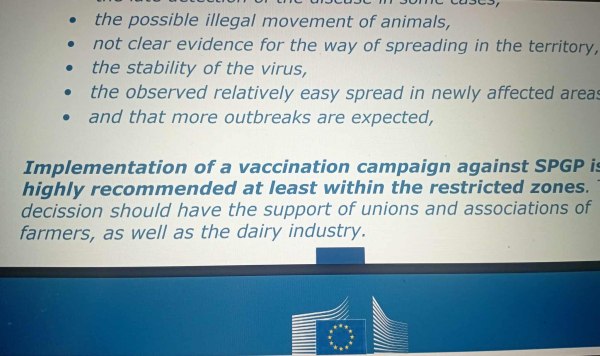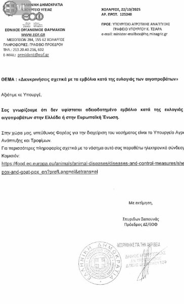 «Η υπεύθυνη Επιτροπή Κτηνιατρικής της Κομισιόν, μας ενημέρωσε ότι προτίθενται να δημιουργήσουν ένα εμβολιαστικό πρόγραμμα για την ευλογιά των αιγοπροβάτων στην Ελλάδα, το οποίο θα είναι με εμβόλιο εγκεκριμένα από την Ευρωπαϊκή Ενωση, αρκεί να το ζητήσει η χώρα. Θα πρέπει να σταλεί μία επιτροπή εμπειρογνωμόνων από τη χώρα, για να διαπραγματευτεί τους όρους με τους οποίους θα εξελιχθεί η διαδικασία. Χθες, η Επιτροπή αυτή έπρεπε να μεταβεί για συζητήσεις στις Βρυξέλλες και να ξεκινήσει το εμβολιαστικό πρόγραμμα που θα περιλαμβάνει τη Θεσσαλία».