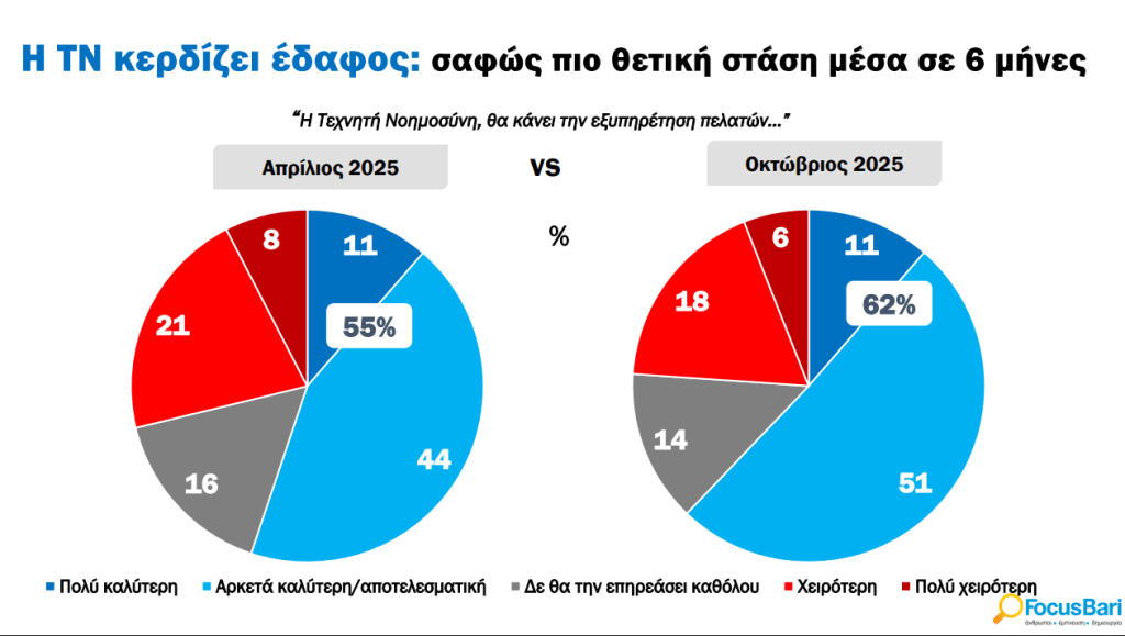 Ενισχύεται η θετική στάση των Ελλήνων απέναντι στην τεχνητή νοημόσυνη, καθώς η αποδοχή της στην εξυπηρέτηση αυξάνεται από 55% (Απρίλιος) σε 62% (Οκτώβριος), με βασικούς λόγους τη διαθεσιμότητα (52%) και την αμεσότητα (41%) που προσφέρει, σύμφωνα με τη νέα πανελλαδική έρευνα «CX Stories: Η επόμενη εποχή – η δύναμη της εμπειρίας» της Focus Bari.
