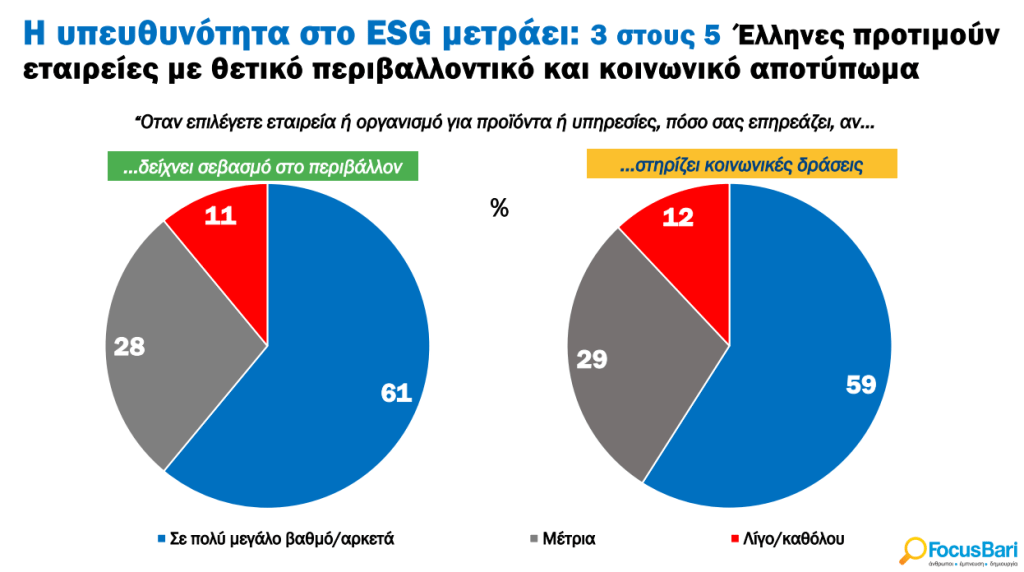 Εν τω μεταξύ, η υπευθυνότητα στο ESG μετράει: 3 στους 5 Έλληνες προτιμούν εταιρείες με θετικό περιβαλλοντικό και κοινωνικό αποτύπωμα.