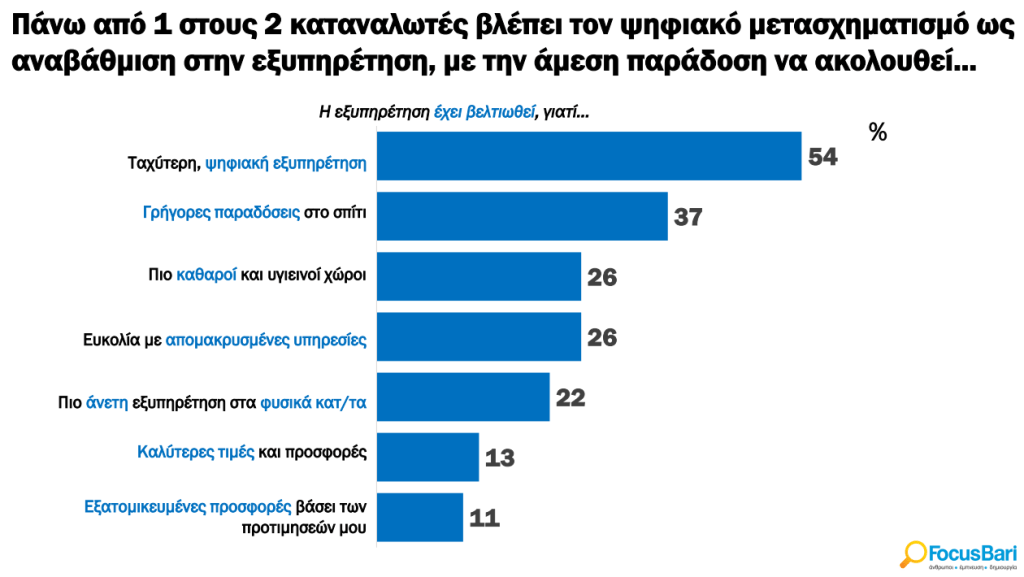 Οι ερωτηθέντες στο πλαίσιο της έρευνας κλήθηκαν να αποτιμήσουν τη βελτίωση στην εξυπηρέτηση σε διάφορους κλάδους. Το 53% δήλωσε ότι έχει βελτιωθεί πολύ/αρκετά, με 52% ακολουθούν τα εστιατόρια/delivery, τα σούπερ μάρκετ με 48%, οι τηλεπικοινωνίες με 42% και η πρώτη πεντάδα συμπληρώνεται από τον τομέα ταξίδια/διακοπές με 41%.