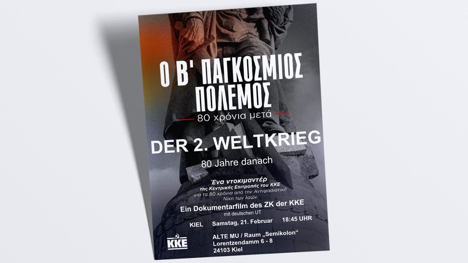 Σε εκδήλωση του ΚΚΕ στο Κίελο θα προβληθεί με γερμανικούς υπότιτλους το ντοκιμαντέρ της ΚΕ του ΚΚΕ «Ο Β’ Παγκόσμιος Πόλεμος – 80 χρόνια μετά» το Σάββατο 21 Φλεβάρη στις 6.45 μ.μ., στην αίθουσα Semikolon του χώρου Alte Mu (Lorentzendamm 6-8, 24103 Kiel).