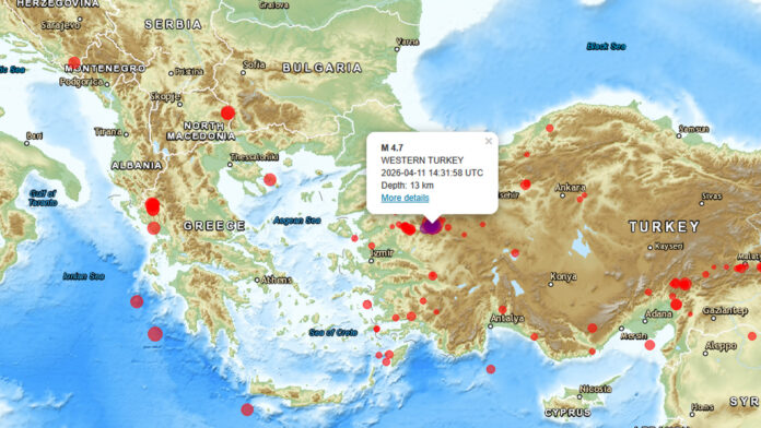 Σεισμική δόνηση μεγέθους 4,7 Ρίχτερ σημειώθηκε το απόγευμα του Σαββάτου (11/4) στη Δυτική Τουρκία. Το επίκεντρο του σεισμού ήταν 22 χιλιόμετρα Νότια της περιοχής Simav στη γειτονική χώρα. Ο σεισμός σημειώθηκε σε βάθος 9,12 χιλιομέτρων.Ο κυβερνήτης της Κιουτάχειας, Μούσα Ισίν, σε δήλωσή του σημείωσε ότι «ο σεισμός έγινε αισθητός και στις γύρω επαρχίες και ευτυχώς, μέχρι στιγμής δεν έχουν αναφερθεί σοβαρές αρνητικές συνέπειες».