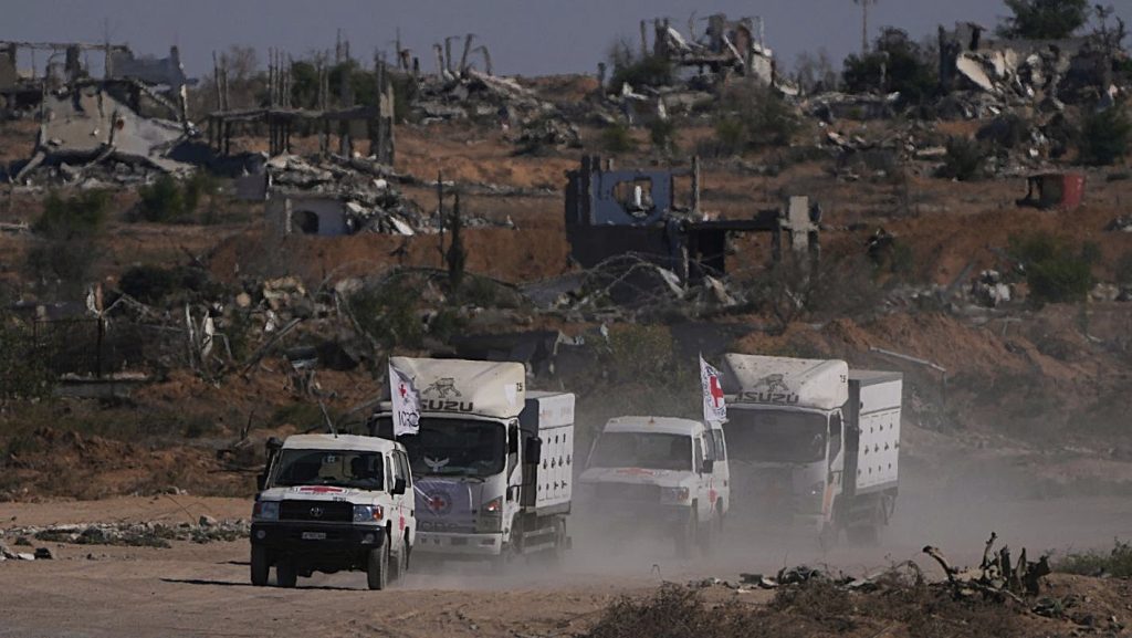 Ένα κονβόι του Ερυθρού Σταυρού μεταφέρει τις σορούς Παλαιστίνιων που κρατούνταν από το Ισραήλ στο Ντεΐρ αλ-Μπαλά, Γάζα. (AP/Abdel Kareem Hana)